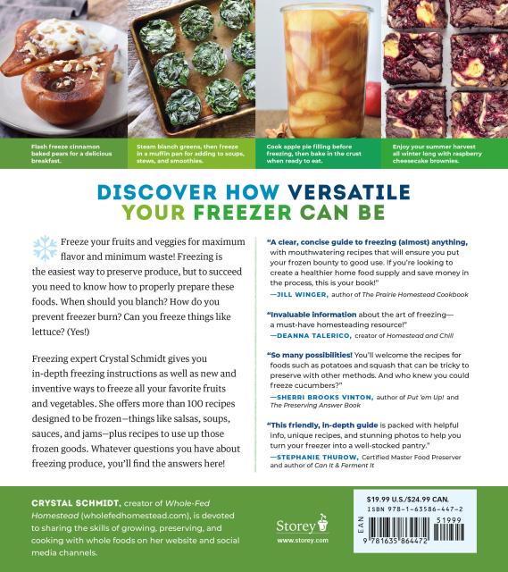 Author Crystal Schmidt’s time-tested preparation techniques ensure that color, texture, and flavor are retained in the freezer. From familiar favorites like apples, corn, potatoes, and peas to surprises like lettuce, avocado, and citrus fruits, Schmidt details the best ways to prepare each food for the freezer, including pre-cooking, slicing, blanching, and more. She offers more than 100 recipes that freeze well, such as Blueberry Maple Pancake Sauce, Pickled Sliced Beets, Mango Chutney, and Honey Butter Carrot Mash, as well as delicious ways to cook the frozen food after thawing, including Creamy Parmesan Confetti Corn, Tart Cherry Oatmeal Bars, and Broccoli Cheese Soup. Home cooks and gardeners alike will love discovering how easy and economical it can be to fill your freezer with produce customized to your own tastes and needs.