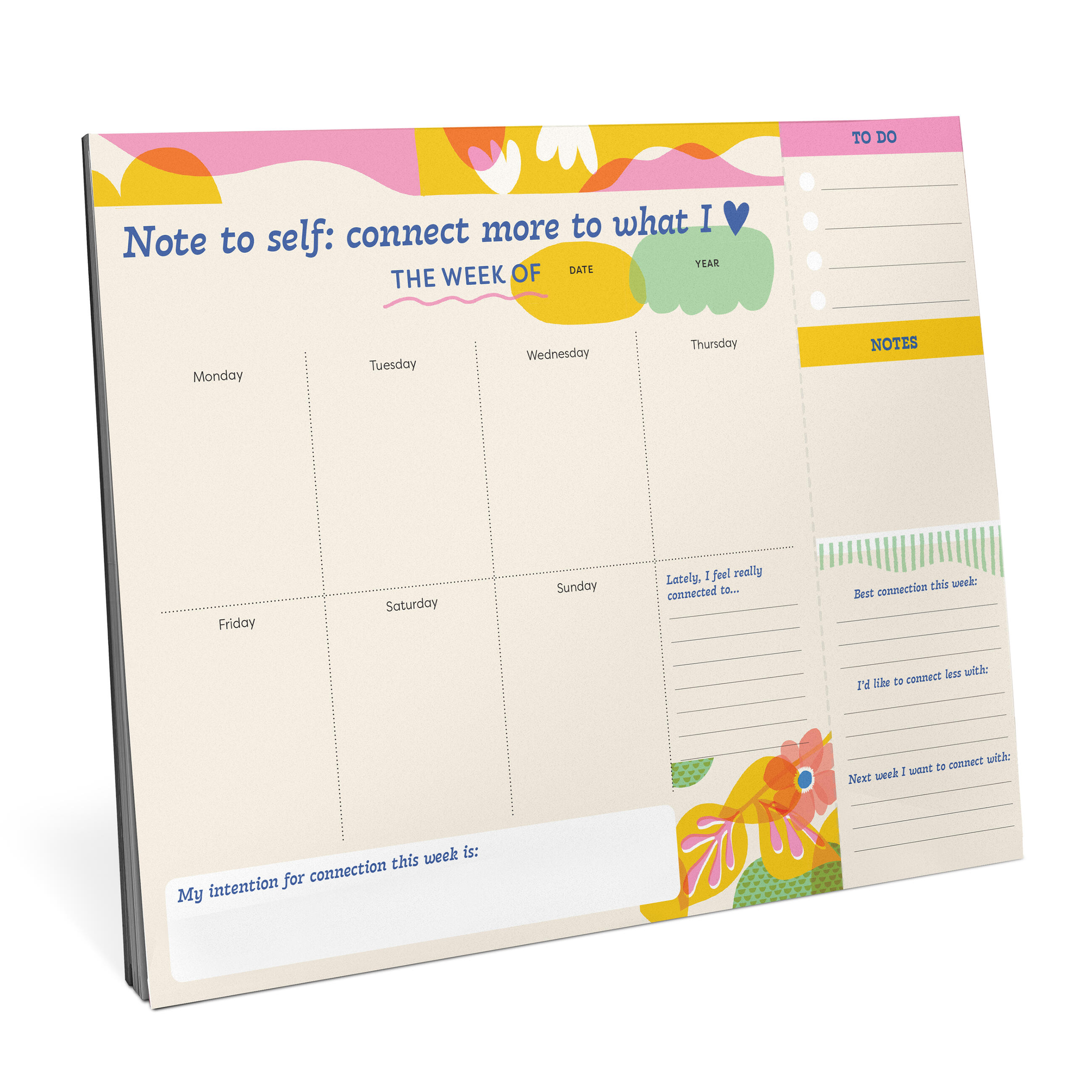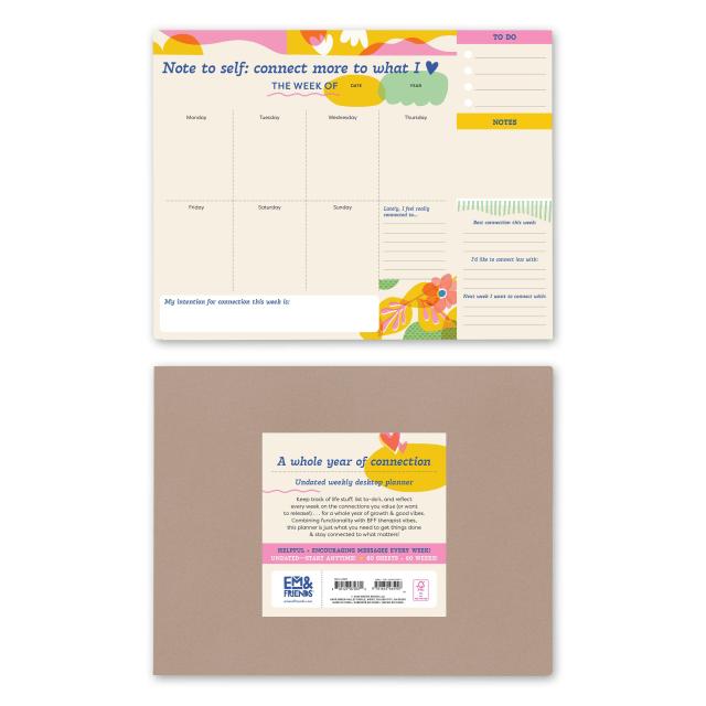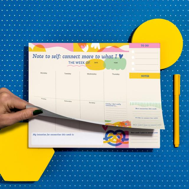 This undated weekly planner pad is super functional and super supportive — if we may say so ourselves. It allows you to plan at your own pace, while offering gentle guidance toward keeping you connected, (and in some cases – supporting you to UN-connect!) to what really matters to you in the moment. Space for declaring a weekly intention for connection, a to-do list, and notes, plus gentle prompts that’ll guide you toward your productivity priorities. This functional planner is just what you need to take care of your everyday life.