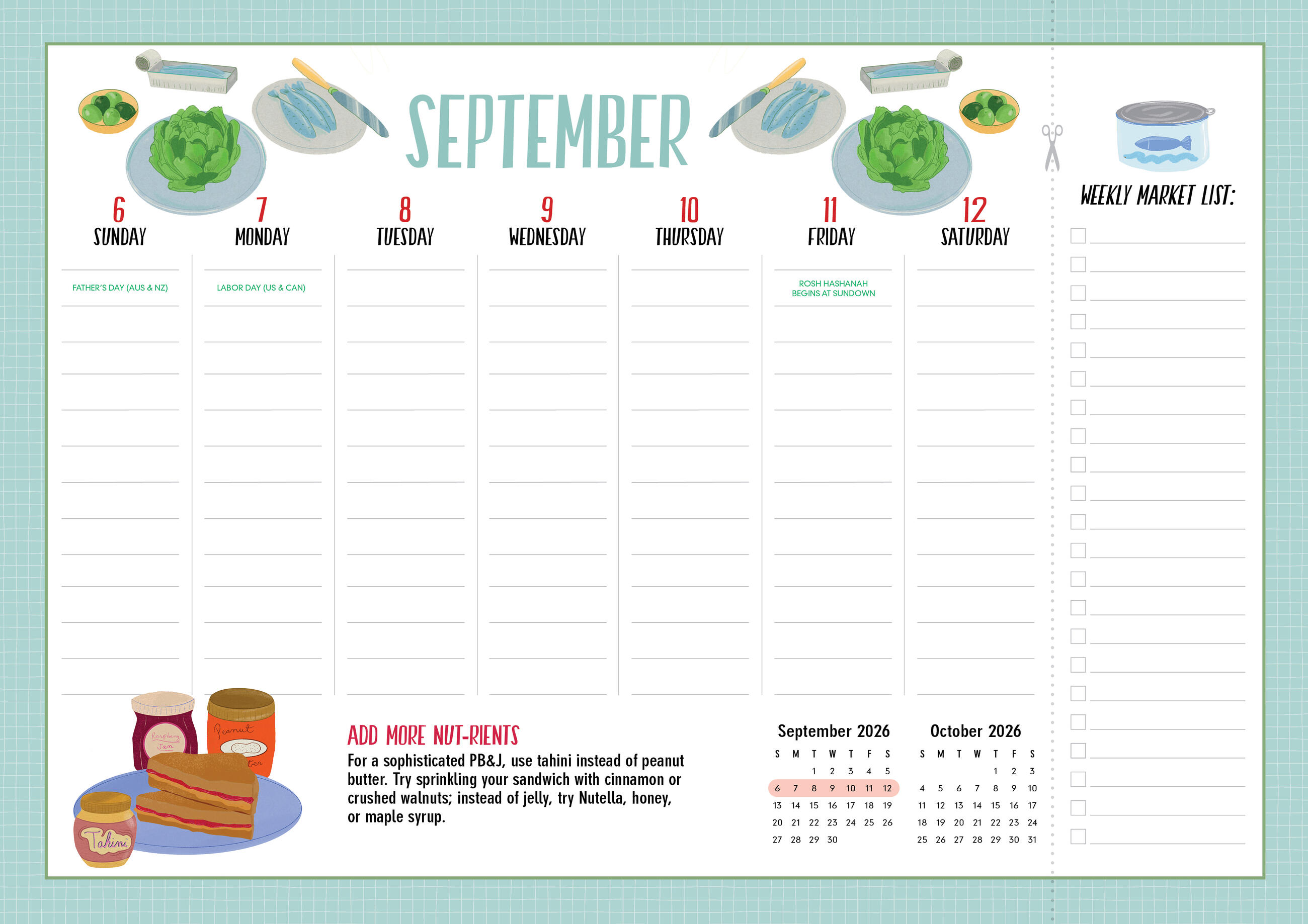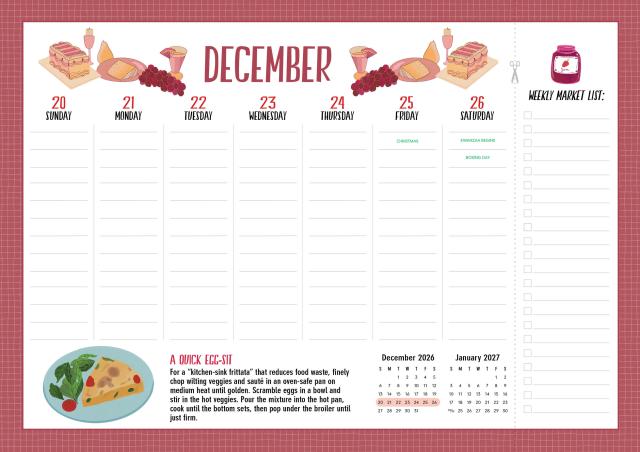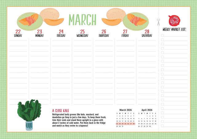 - THE ULTIMATE KITCHEN CALENDAR: Includes space for your grocery list, clever kitchen tips, and charming food-themed illustrations to cheer up your meal planning.