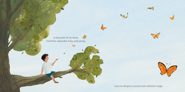 On an ambling walk, a child discovers they hold the promise of larger worlds—forests and meadows—in the palm of their hand. An acorn becomes a tree within a woodland wonderland. A grain of sand becomes a sandcastle in a kingdom of imagination. By exploring nature’s tiniest details, they learn even small things, including them, contain infinite potential.