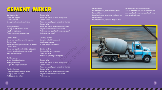 “In this substantial collection, readers will find songs about both familiar vehicles, like garbage trucks and cement mixers, and lesser-known, high-appeal wheeled machines such as the impressive rock crawler and road zipper, which moves concrete lane dividers.”Kirkus Reviews