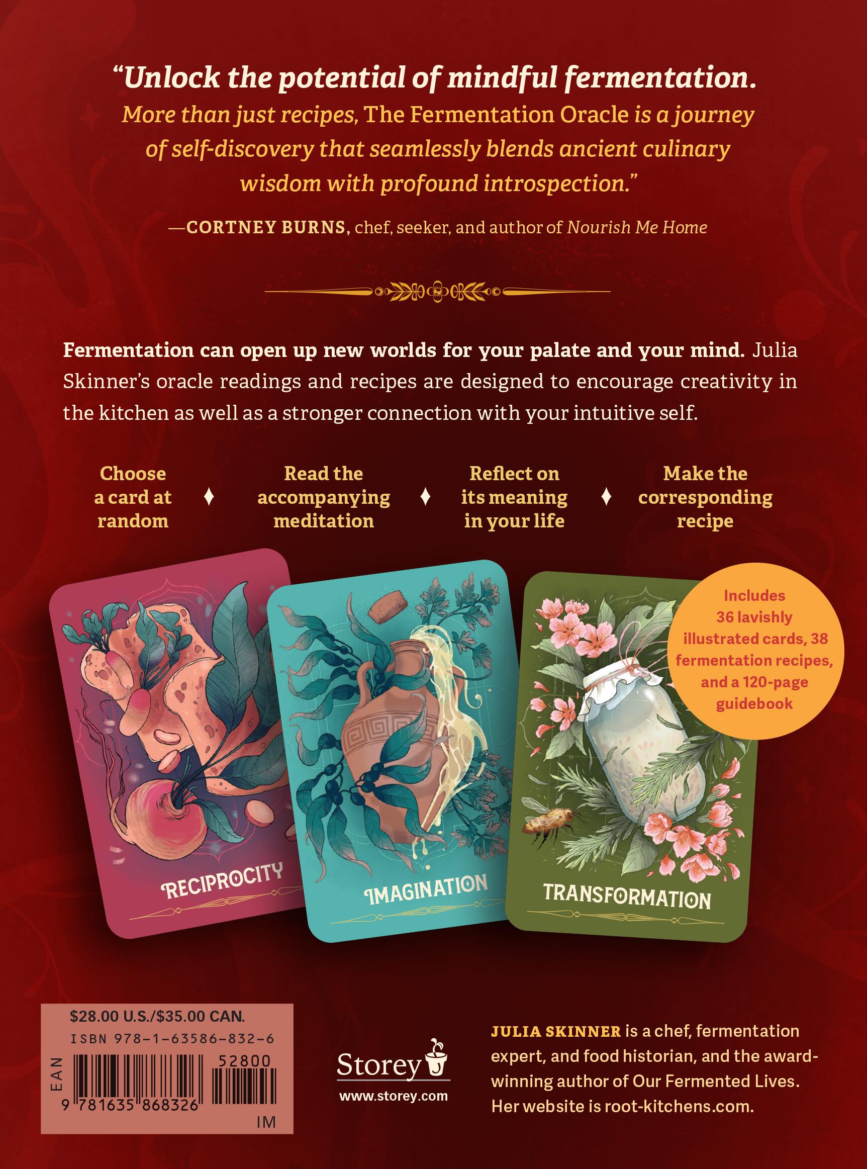 Fermentation is an adventure—whether you’re collecting new cultures from foreign lands, riffing on a traditional recipe to create a totally new food, or allowing the process to lead you to moments of self-reflection. In The Fermentation Oracle, author Julia Skinner opens a portal to new culinary and personal explorations by sharing 36 guided meditations on the properties of each ferment, intended to help you think creatively about the gifts of that particular food or drink, access intuition, and navigate each day’s joys and problems more thoughtfully. The book is packaged with a deck of 36 lavishly illustrated oracle cards to spark your next culinary adventure and 38 creative recipes inspired by the readings that accompany them.
