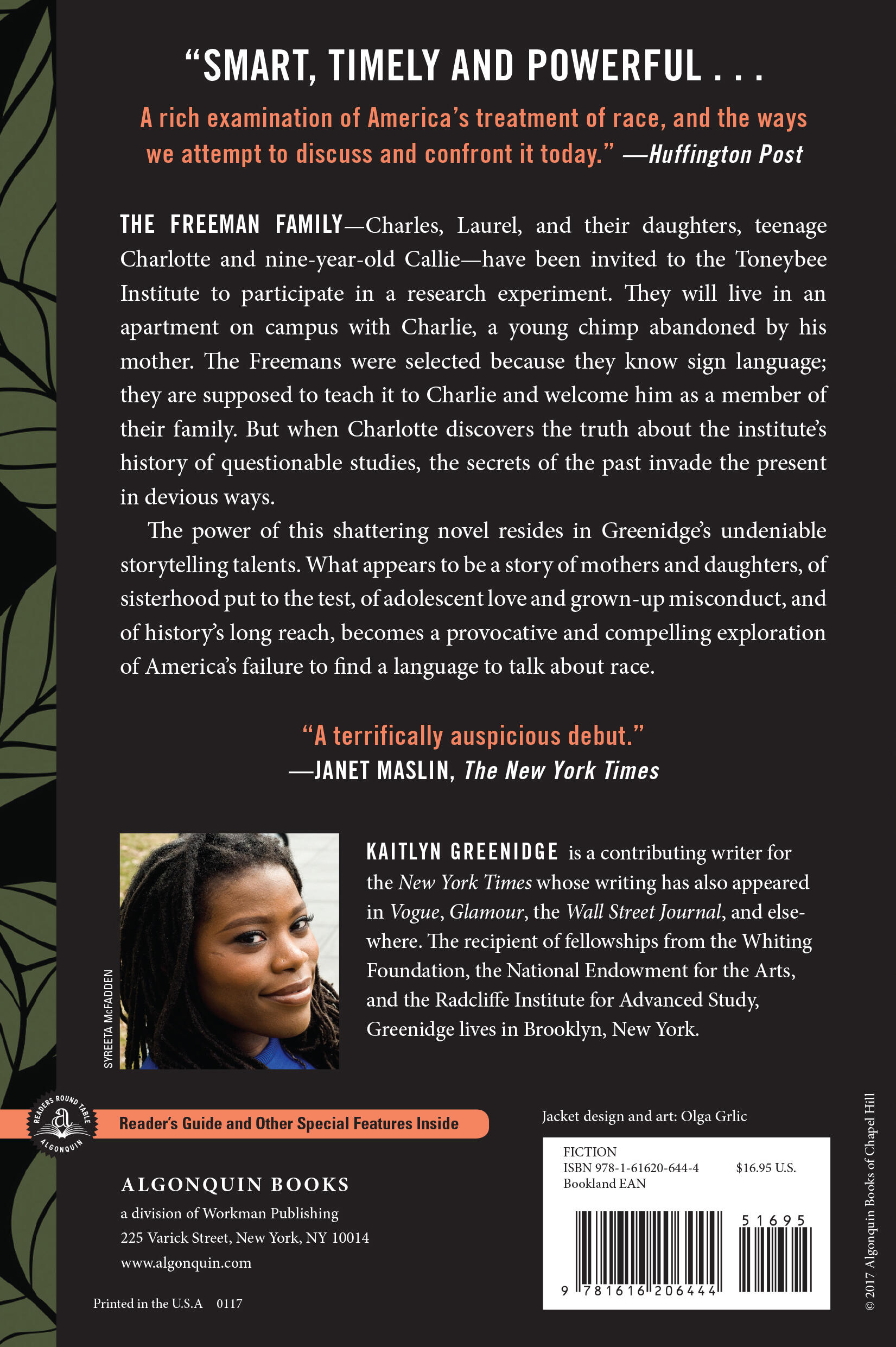 “This fantastic debut novel tackles important subjects—race and culture, language and communication—frankly and with grace. Kaitlyn Greenidge's story follows an African-American family hired to teach sign language to a chimp, but a dark history follows the institute behind the experiment. Charlie Freeman has so many elements of a great read: thoughtful construction, precise prose, and a beating heart.” I>Elle.com