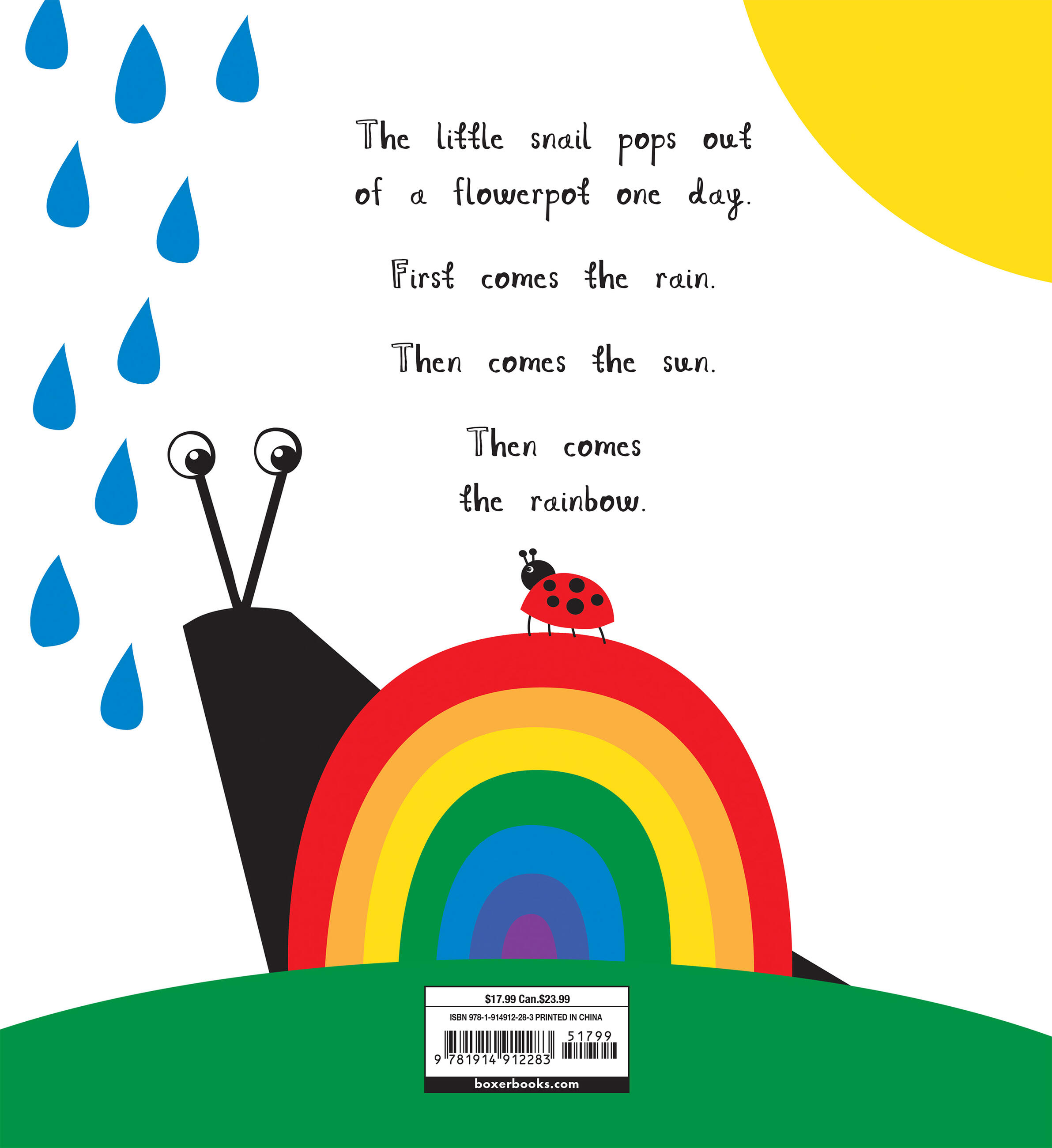 Blue like the raindrops. Green like the soft grass. Yellow like the warm sun. This is the story of how the rainbow snail came to be. It takes sun and rain to make a rainbow, and what better combination of colors could there be?
