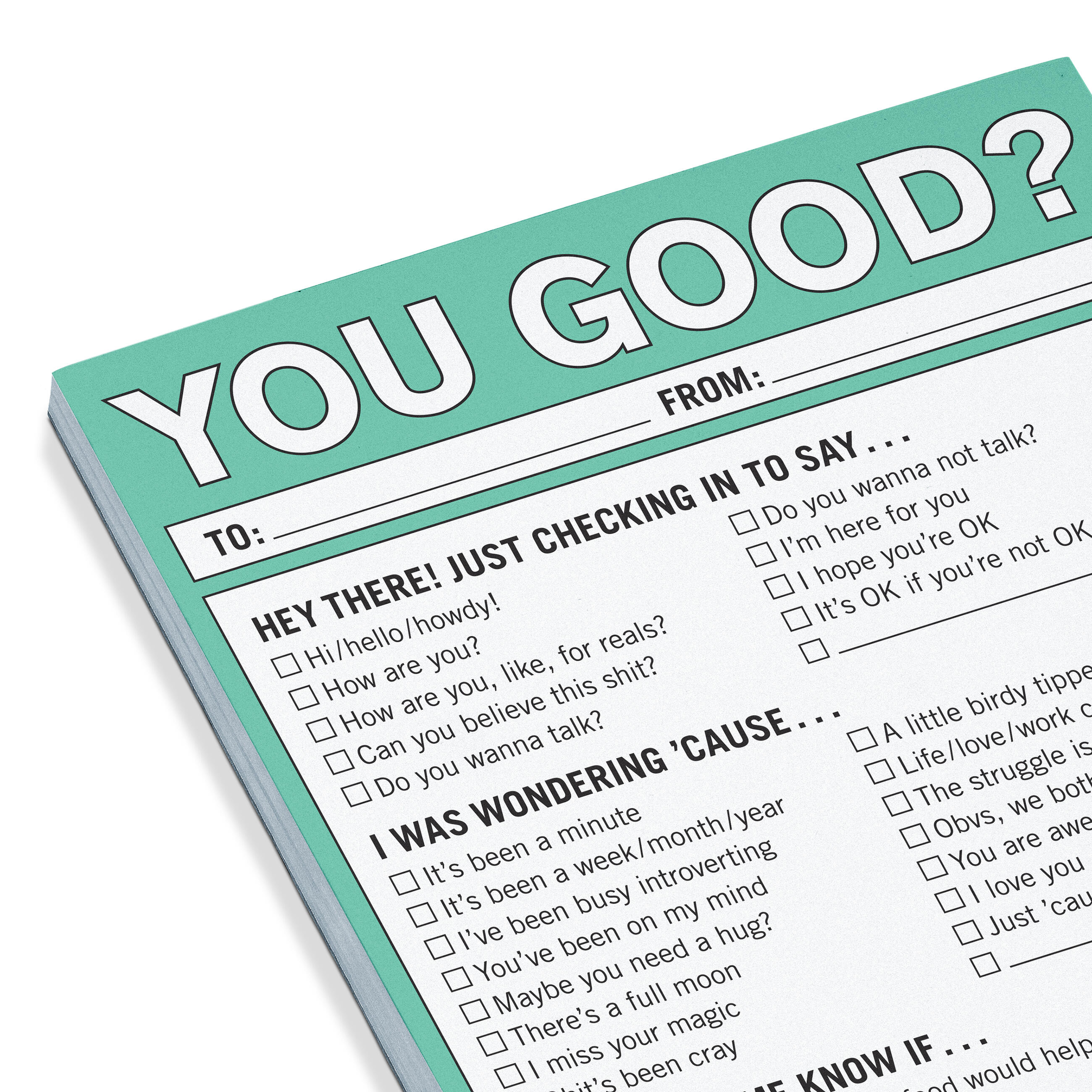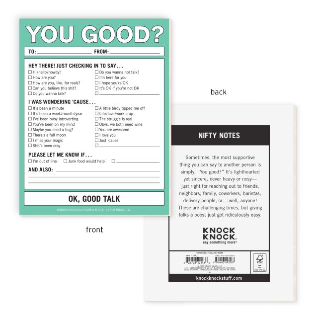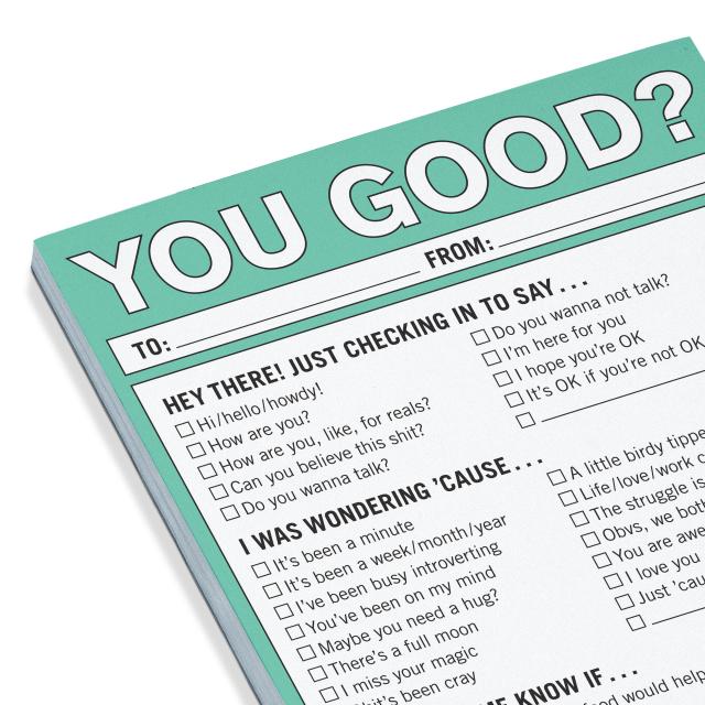 Sometimes, the most supportive thing you can say to another person is simply, “You good?” It’s lighthearted yet sincere, never heavy or nosy— just right for reaching out to friends, neighbors, family, coworkers, baristas, delivery people, or…well, anyone!