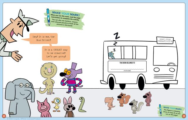 Mo Willems Workshop and Crayola team up for a celebration of creativity with The Pigeon, Elephant and Piggie, and friends in this doodle and play activity book—perfect for little ones to explore their imagination with these beloved characters!