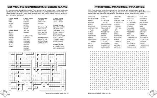 This massive puzzle collection is perfect for anyone who wants all the challenge and intellectual stimulation of participating in Squid Game without the risk of an ignominious death. Enjoy crosswords, word searches, sudoku variants, word logic puzzles, photo puzzles, and more, all inspired by your favorite games from Squid Game and Squid Game: The Challenge like Red Light Green Light, Tug of War, Glass Bridge, Sugar Honeycombs, Marbles, and more.