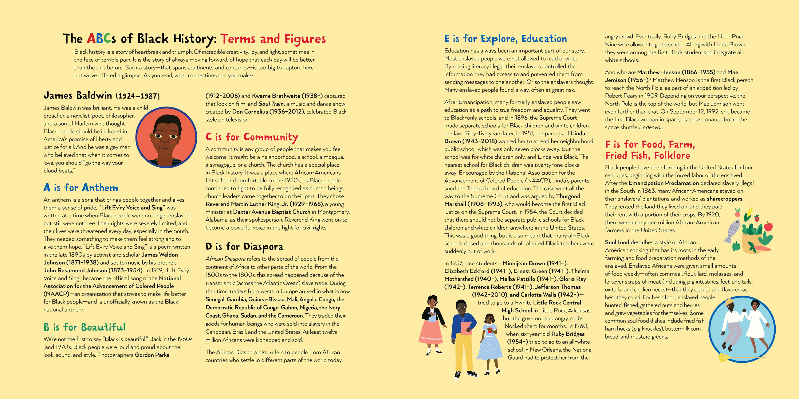 In addition to rhyming text, the book includes back matter with information on the events, places, and people mentioned in the poem, from Mae Jemison to W. E. B. Du Bois, Fannie Lou Hamer to Sam Cooke, and the Little Rock Nine to DJ Kool Herc.