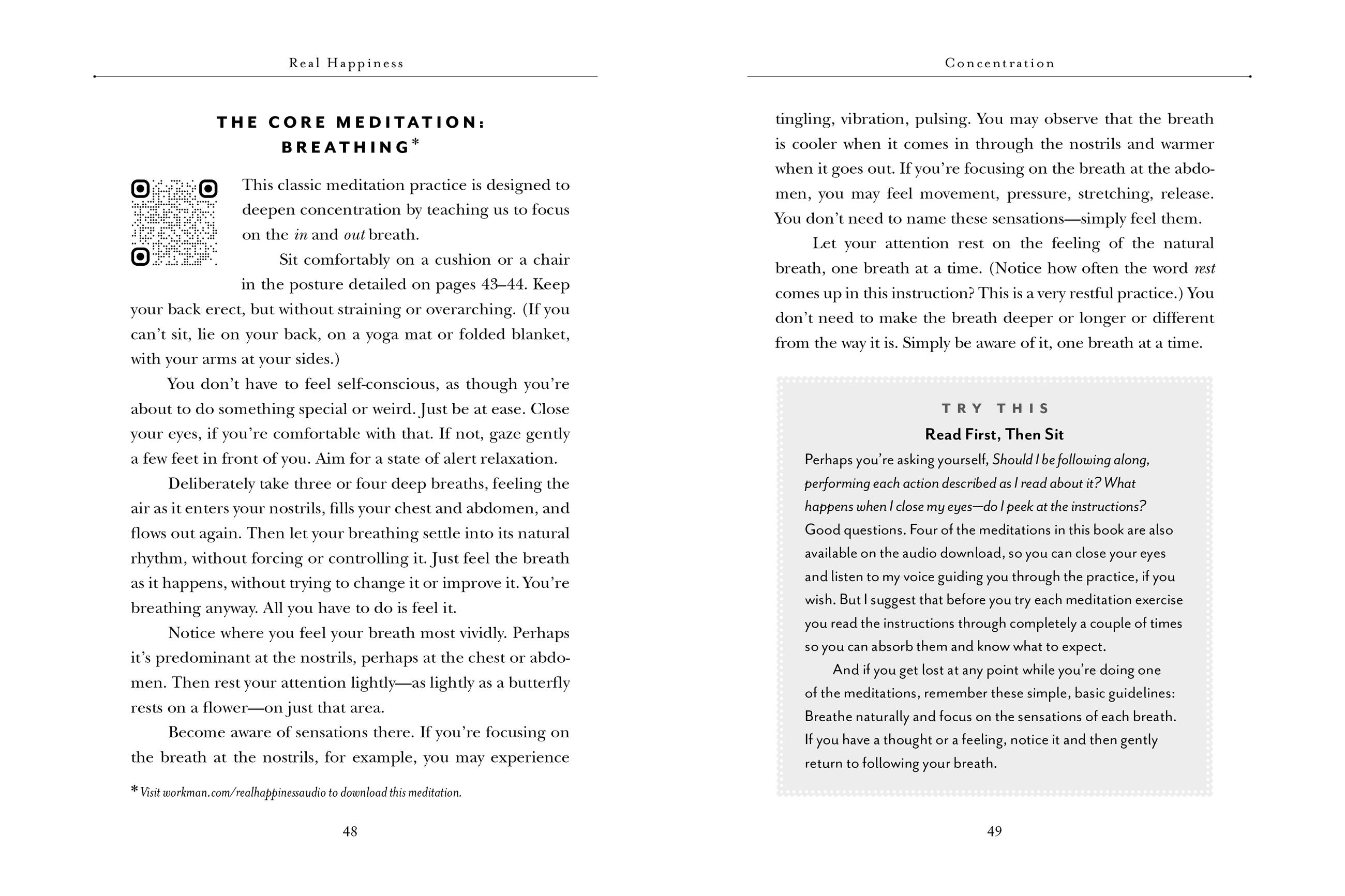 From Sharon Salzberg, a pioneer in the field of meditation and world-renowned teacher acclaimed for her down-to-earth style, Real Happiness is a complete guide to starting and maintaining a meditation practice. Beginning with the simplest breathing and sitting techniques, and based on three key skills—concentration, mindfulness, and lovingkindness—it’s a practice anyone can do and that can transform our lives by bringing us greater resiliency, creativity, peace, clarity, and balance.