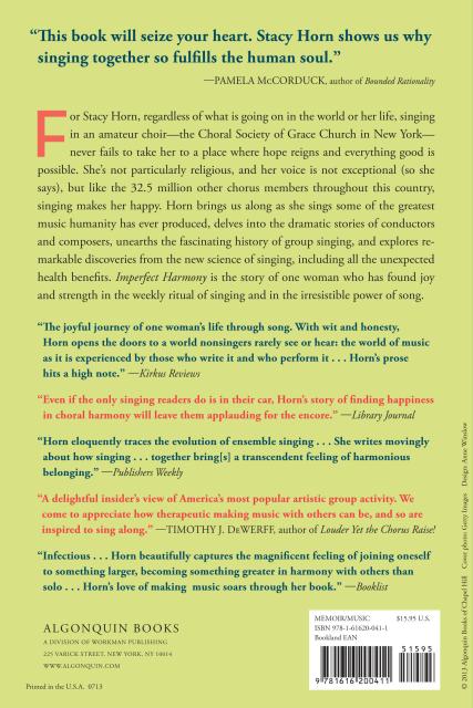 For Stacy Horn, regardless of what is going on in the world or her life, singing in an amateur choir—the Choral Society of Grace Church in New York—never fails to take her to a place where hope reigns and everything good is possible. She’s not particularly religious, and her voice is not exceptional (so she says), but like the 32.5 million other chorus members throughout this country, singing makes her happy. Horn brings us along as she sings some of the greatest music humanity has ever produced, delves into the dramatic stories of conductors and composers, unearths the fascinating history of group singing, and explores remarkable discoveries from the new science of singing, including all the unexpected health benefits. Imperfect Harmony is the story of one woman who has found joy and strength in the weekly ritual of singing and in the irresistible power of song.