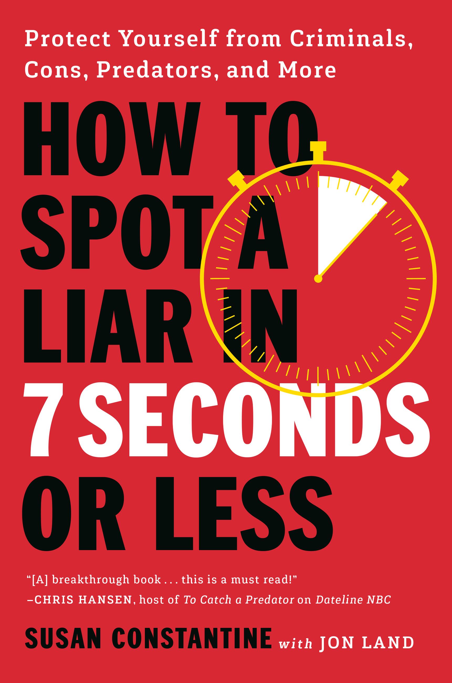“Over the past four decades I’ve confronted hundreds of predators seeking to exploit children, parents and grandparents. From sexual predators to financial predators all over the world…all with one thing in common: they all tried to lie to me. It’s been no easy task to get the truth! Now, Susan Constantine, in her breakthrough book, HOW TO SPOT A LIAR IN 7 SECONDS OR LESS, takes us inside the minds of sociopaths and serial liars… and teaches us exactly how to spot them! Protect yourselves.! This is a must read!”Chris Hansen, Host of TO CATCH A PREDATOR on Dateline NBC and PREDATORS I CAUGHT on Spotify