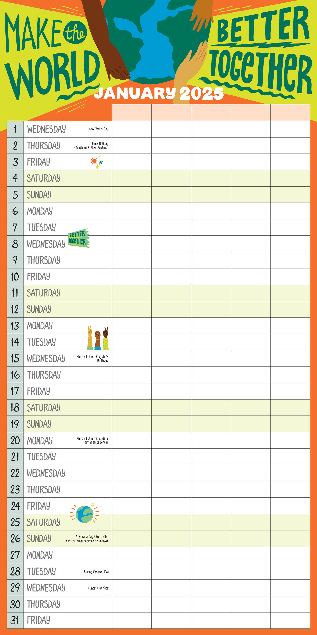 - WARMTH, INSPIRATION – AND STICKERS!: Each month features different fun illustrations and empowering messages like There is power in our unity. Plus a drop-down storage pocket and over 170 stickers for marking special days!