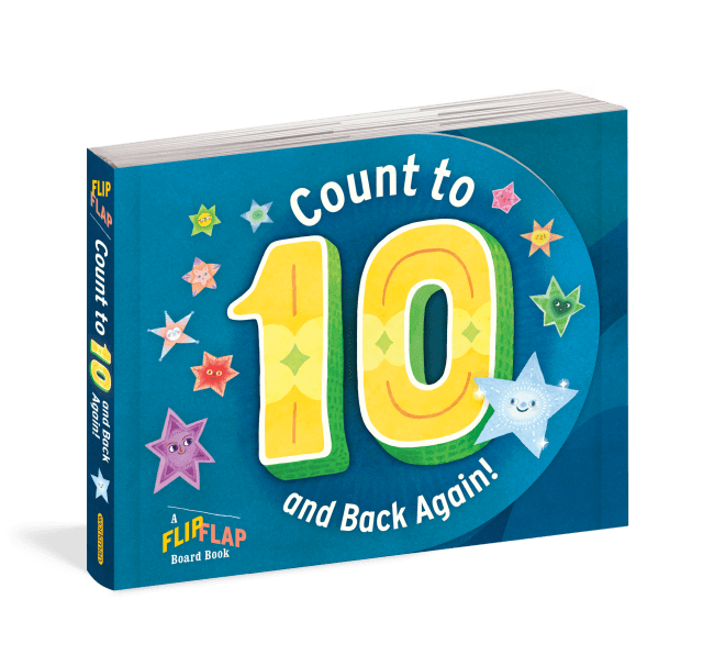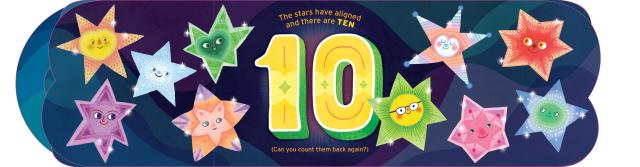 This board book has two spines—one on each side—so that the book opens outward left and right. Plus, each page is shaped like a number from 1 to 10! As new stars appear in the darkening night sky, count them along with the rhyming text: