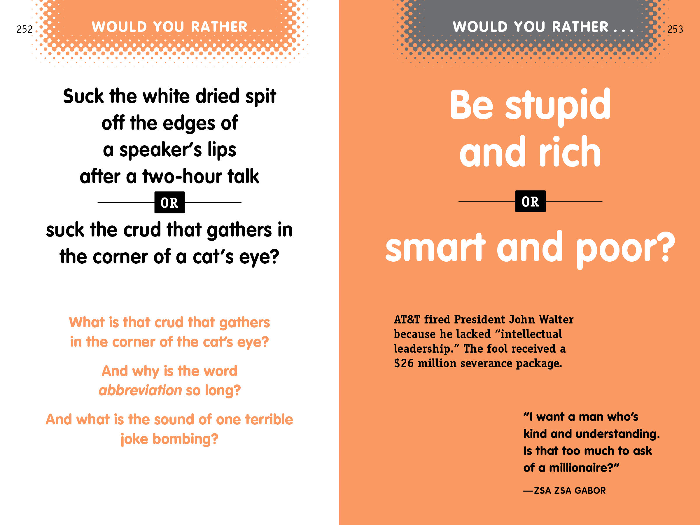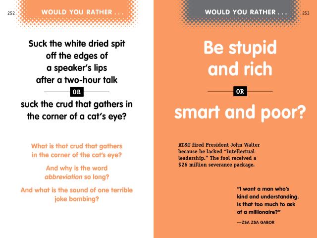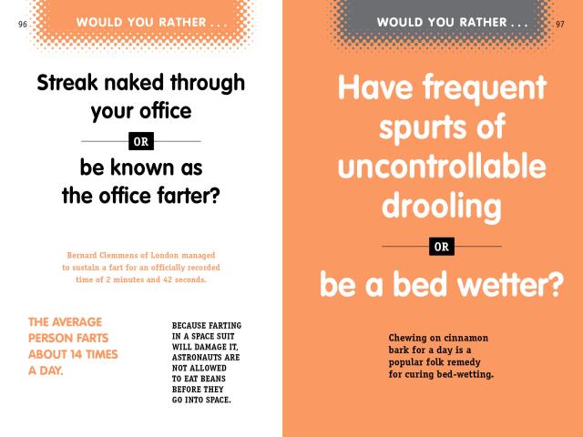Warning! This book contains shocking content meant to inspire hilarious discussion. These field-tested conversation starters are guaranteed to provoke ridiculous fun, break the ice, and—if played correctly—open a unique window into the twisted imaginations of friends and family. It’s an addictive game in a book that challenges readers to ask—and answer—more than 100 questions that rank from the heinous to the outrageously funny.